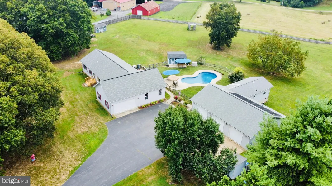 Entertainers Delight, this spacious rambler offers in ground pool, cabana house complete with bathroom, water & electric, detached 3 car garage w/ accessory apartment or would be perfect for a home based business office. Main house features 4 bdrms w/ 2 full baths, large family room off of the kitchen with door to the deck & pool area, Kitchen has movable island, solid wood cabinetry , pellet stove , laundry & large pantry. The kitchen offers plenty of natural lighting with large window & slider to deck & pool. Front entry goes into a formal living room w/ hardwood flooring.. A NEW roof on both house and garage/guesthouse installed week of 7/27. (Solar Panels are no longer there) New high efficient heat pump. Large deck off of kitchen just power washed & stained. . The back yard with in ground pool offers the ultimate place to entertain or relax. Cabana also has ice machine & refrigerator . Its truly a scenic back yard with gorgeous view of surrounding farms & pastures. The oversized detached garage offers oil heat, guest apartment/office with full kitchen, laundry & bath with its own septic. The spacious detached garage is perfect for the car enthusiast or home based business. The property offers space & options for farm animals/horses/livestock. No HOAs and located outside of the Laplata town limits.. A total of 5 garage spaces, 2 in the main house and 3 in the detached garage. Oversized driveway provides and back up areas provide additional parking and would accommodate a boat/RV . Storage sheds offer additional space. Nest security system conveys. Close to shopping, dining, entertainment, hospital, library & commuter routes/parking. This home is ready for immediate occupancy. **pool liner replaced May 2020, winter cover fall 2020