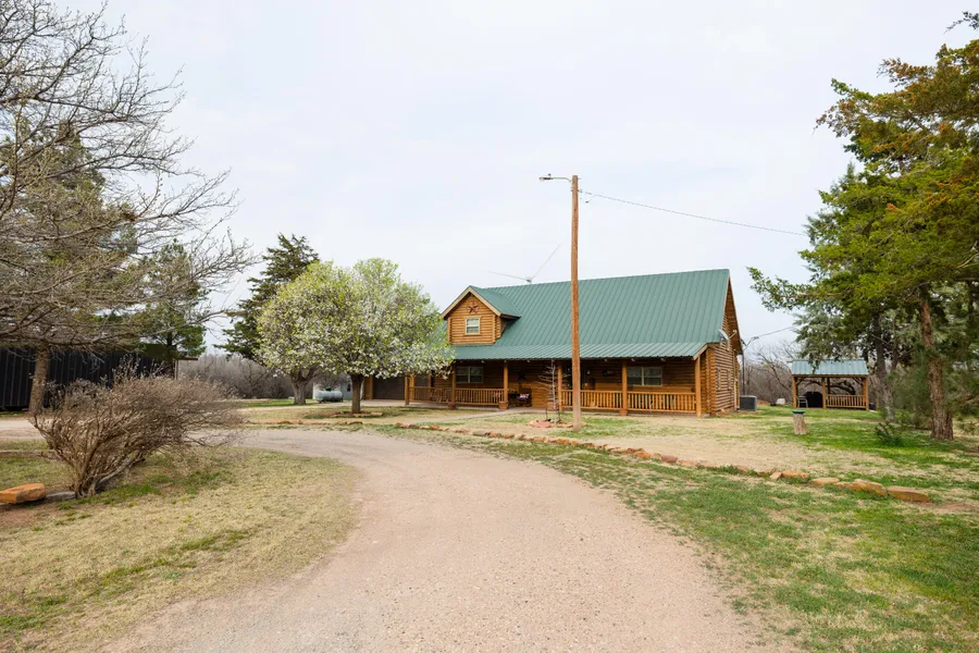 TWO STORY LOG CABIN! This property is truly stunning. This 3-bed 2.5-bath home was built in 2002 and is located on approximately 160 Acres. This property also has pens & paddocks for your horses or other types of livestock. A large metal barn, cement water tank & windmill, gazebo, and even a small office/workshop are also located around the home.