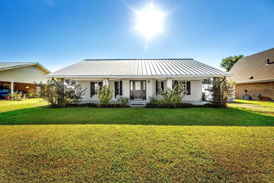 New Listing Alert! Cozy 3 bedroom, 2 bath home in sought after Bayou Blue area. FLOOD ZONE X. This home features a large open floor plan. Primary bedroom with en suite bathroom, with jacuzzi tub. Large island, with plenty of cabinet space, and a built-in refrigerator. Uniquely built out of cinder blocks and metal framing, which gives you added security during hurricane season. New metal roof, with no exposed screws, which adds to its longevity. New AC unit and duct work installed in 2024. This beauty contains a sunroom, which allows maximized sunlight and provides views to the outdoors. It can be used for whatever your heart desires!