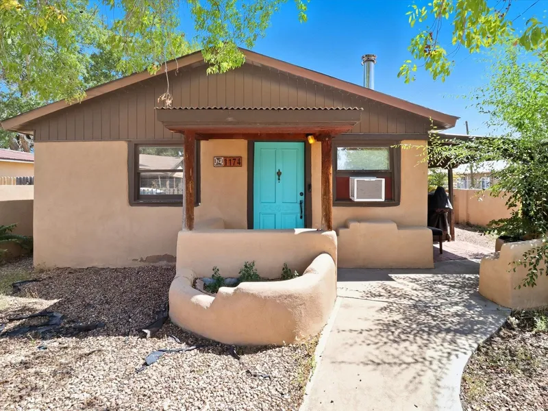 Situated on a corner lot, this charming home in the heart of Bernalillo is the epitome of New Mexico living, boasting vigas, adobe walls and brick floors. This inviting home offers 2 bedrooms on the main level and a large private primary suite on the top floor, with a balcony facing the Sandia Mountains. Outdoors, enjoy a walled yard around the entire property, private courtyards, covered patios, and a two-car carport. Located close to schools, parks, restaurants, and the Rio Grande.