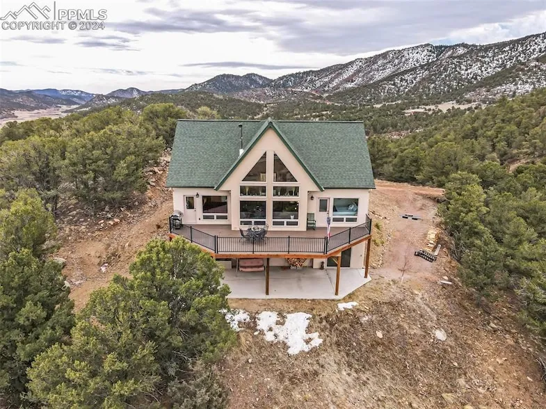 This custom-built home offers an idyllic retreat with the year-round Currant Creek meandering through the property, inviting you to cast your fly into one of the numerous ponds or observe the playful beavers. The home exudes elegance featuring solid hickory doors, a kitchen with solid hickory cabinets, porcelain floors, stainless steel appliances and solid surface counters. Enjoy year-round comfort with heat/AC, along with a wood-burning stove. The master bedroom is a sanctuary with 360-degree views, walk-in closet, and a luxurious bathroom boasting a soaking tub and walk-in shower. Additional accommodations include a 2nd main-floor bedroom and a third bedroom upstairs. The loft space can serve as a separate living area, office, or rec room. The heated partially finished walk-out basement offers limitless possibilities, featuring a giant laundry room w/ a large pantry closet that could easily double as a fourth bedroom, and a convenient 3/4 bathroom. Outside, the expansive Trex Deck and concrete patio provide a perfect place to admire the surrounding mountains, with propane hookups facilitating effortless outdoor cooking. The home is equipped with wiring for a generator. The detached 32x32 garage offers ample space for vehicles and storage, complete with solar power. The well report shows 10 GPM! Located in GMU 58 for excellent hunting, 20 minutes to town, 15 minutes to world class fishing, 1.5 hours to Breckenridge or Monarch Mt