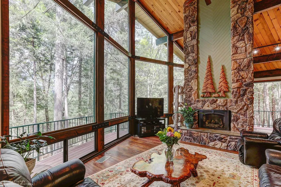 Serenity abounds this mountain home nestled on a manicured 5+ acres just 2 miles to Historic downtown Nevada City. Impeccable and bright, this great home has soaring windows and vaulted ceilings in living room with a great, spacious kitchen overlooking the living room, plus formal dining room and sitting room with outside access onto large deck. NID trail through the property for leisurely walk opportunities. Magical master suite with big windows brings the forest setting indoors, plus huge walk in closet and great master bath. 3 bedrooms, plus office, lovely entry with access to throughout the house but also to a wonderful entertainment deck. Generous 2 car garage plus paved driveway with room for lots of vehicles. The property is beautifully manicured but low maintenance at the same time and has filtered views of Harmony Ridge. Located on the cul-de-sac in a high-end, established neighborhood. This home is the epitome of a Nevada City dream!