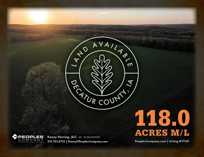 Peoples Company proudly presents this outstanding 118-acre m/l recreational property situated north of Grand River in Decatur County, Iowa. This premier recreational farm features approximately 65 acres m/l of pristine mature hardwood timber along the north and west sides of the property. Within the timber, a variety of deciduous trees thrive, including oak, hickory, maple, walnut, and more. Additionally, Sand Creek borders the far northeast corner of the property, adding to its natural allure.