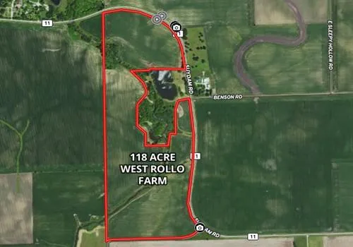 The city of Earlville is 6.8 miles south and the city of Rollo is 1.5 miles west of the farm. The DeKalb Taylor Regional Airport (KDKP) is 26.8 miles to the north and the Rochelle Municipal Airport (RPJ) is 26 miles to the northwest. This property is 5.1 miles south of the Shabbona Lake State Park.