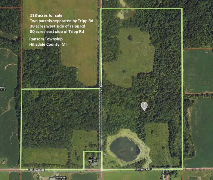 For sale here is 118 acres of great whitetail habitat ....... and some really awesome places to build a home as well. The way this property lays out (see aerial map) is that there is an 80 acre parcel on the NE corner of Tripp Rd which runs north and south, and Tamarack Rd which runs east and west, and then there is an adjoining 38 acre parcel on the opposite (west) side of Tripp Rd.