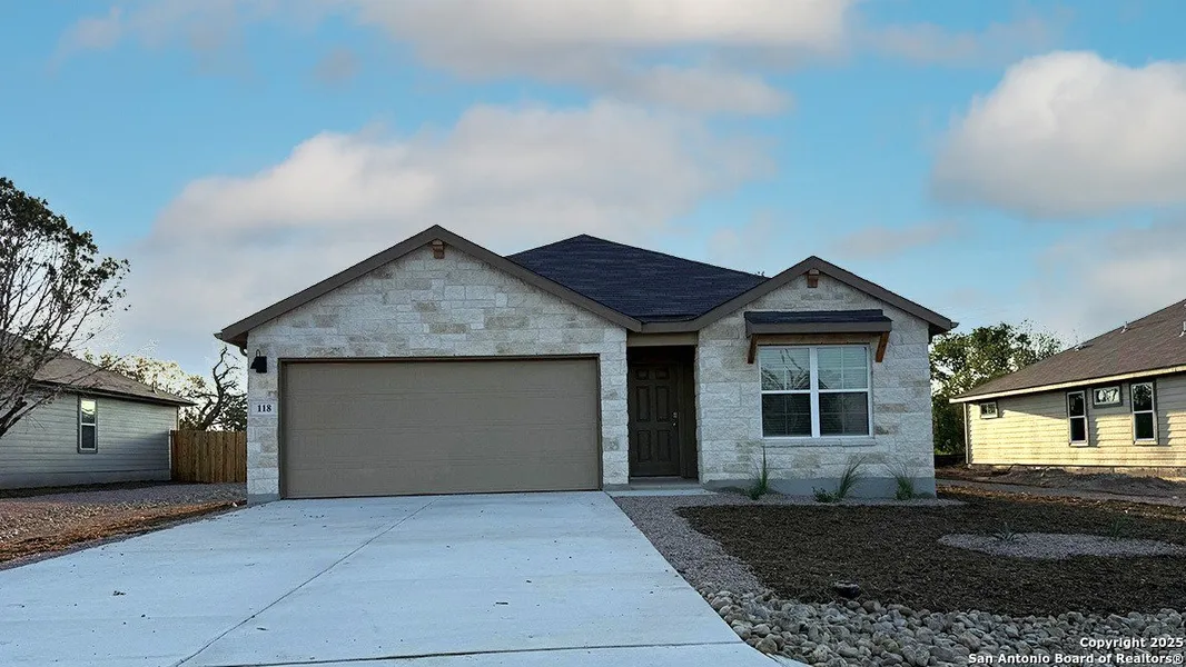 The Bryant is a stunning single-story home featured at High Garden in Comfort, TX. The Bryant is sure to impress with its selection of 3 front exteriors, 4 bedrooms, 2 bathrooms and 2-car garage. Welcome guests as they walk through the elongated foyer with a decorative nook wall feature to the spacious eat-in kitchen. Facing the blended dining area and living room, the kitchen includes an oversized island, corner pantry with shelving, plenty of cabinet storage, quartz countertops, stylish subway tile backsplash, stainless steel appliances, and a electric cooking range. The private main bedroom is located at the back of the house and features a relaxing ensuite bathroom complete with double vanities, a garden tub, walk-in shower, and a spacious walk-in closet. If privacy is your top priority, this bathroom comes standard with a separate water closet. Two secondary bedrooms are located off the entry and the other is centrally located off the kitchen. All have quality carpet, spacious closets and windows for plenty of natural lighting. Whether these rooms become bedrooms or other bonus spaces, there is sure to be comfort and functionality. Additional features include tall 9-foot ceilings, 2-inch faux wood blinds throughout the home, luxury vinyl plank flooring in the entry, family room, kitchen, and dining area, ceramic tile in the bathrooms and utility room, and pre-plumb for water softener loop. Relax outside on a covered patio (per plan) located off the family room and enjoy full yard landscaping and full yard irrigation. You'll enjoy added security in your new home with our Home is Connected features. Using one central hub that talks to all the devices in your home, you can control the lights, thermostat and locks, all from your cellular device.