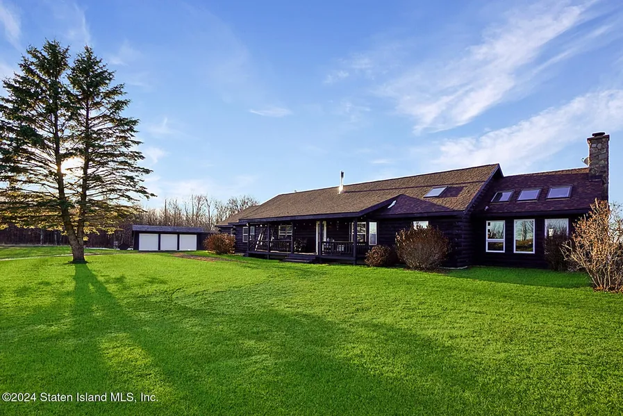 Hidden high in the Catskill Mountains, Stoneridge Cabin offers a rare opportunity to own a true rustic retreat nestled on 18.54 secluded acres with inspiring panoramic mountain views (elevation 2,200 feet) in the hamlet of Charlotteville, New York, less than 3 hours from New York City. The 3,580 square foot log cabin, features ten beautifully designed rooms all on one level, offering a luxurious yet rustic atmosphere. You are greeted by an expansive entry foyer that welcomes you to the great room with hard wood floors, 14 foot ceilings, and a wood burning stove. Head right towards the west wing of the home and you will find a large eat in kitchen with stainless steel appliances, a formal dining room, laundry room, half bathroom, bedroom, and a den with 14 foot ceilings and a fireplace. Head back the other way towards the east wing and you'll find 3 more bedrooms, a 3/4 bathroom, the master bedroom suite with 3/4 bathroom, a 2 car garage, and access to the 1,000 sq ft finished basement with theater and game room. There are 2 additional detached garages on the property, a 2 car garage and a 3 car garage, for a total of 7 cars..perfect for all the toys. This unique property is just a minute walk to the expansive Clapper Hollow State Forest, providing nearly 900 acres of hiking trails, waterfalls, fishing, mountain biking, horseback riding, cross-country skiing, snowshoeing, and snowmobiling. Stone Ridge Cabin is perfect for those seeking solitude, breathtaking views, and access to abundant outdoor activities, the ideal escape for nature lovers and those wanting a peaceful retreat with refined living spaces. Recent renovations include all new black MARVIN windows, new front deck, new rear deck, 3 new bathrooms, new appliances, new black stain on cabin and all garage structures. Used as a summer/holiday residence and also run as a successful AirBnB. Additional acreage available for sale. Broker is owner.