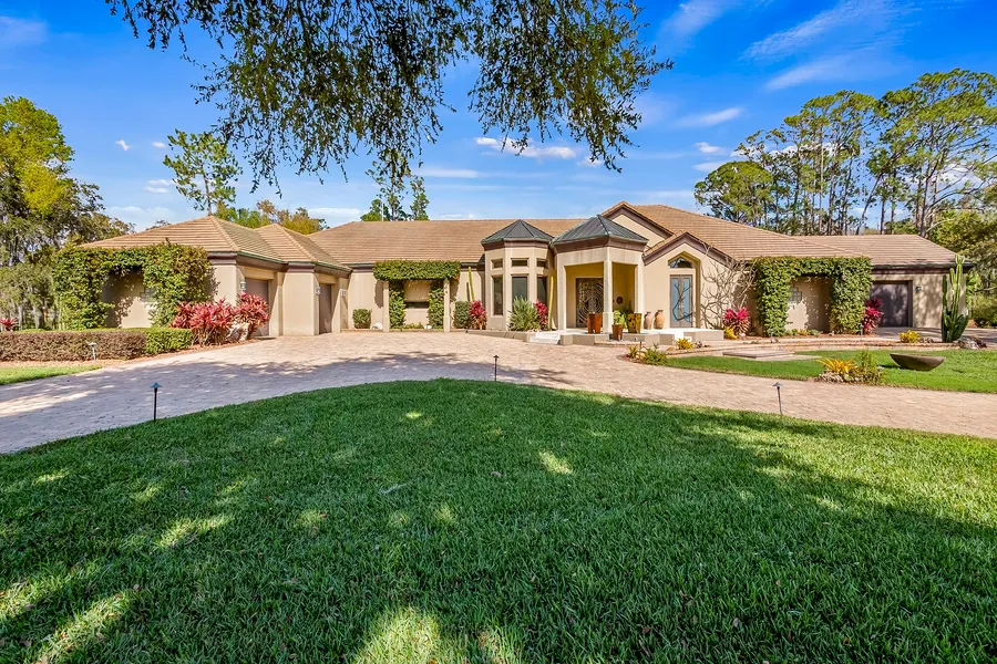 One or more photo(s) has been virtually staged. A Clermont Chain of Lakes direct waterfront home on over 6.5 acres with a gorgeous custom residence and no HOA. Waterski, wakeboard, kayak, fish, or just boat on 13 lakes— with Lake Louisa State Park just off your shoreline. Vacation every day in this fabulous property. Privacy is afforded behind the estate wall as the gate opens to reveal a concrete-paved, circular driveway around a stately old oak tree and manicured grounds, including a vineyard and seven producing citrus trees. The travertine front steps, accented by fountains and lighting, lead you through the custom Patina Copper front doors with views past the pool and rear yard to the lake through the 24-foot wall of sliding glass doors. This great room has 14-foot ceilings with specialty upgrades, including a cocina stone wall and custom lighting to accent tilework, ceiling coves, and niches. The music room has mahogany ceilings and fixed windows at the front of the home, making it an amazing home office, library, or reading space. The kitchen is phenomenal with panoramic views of the lake from almost every angle. Complete with Rutt custom-made cabinets around a large island with granite counters and seating, this is an incredible space for cooking, baking, and entertaining. Dacor double convection ovens plus a warming drawer and seven-burner cooktop, raised Bosch dishwasher, a Sub-Zero under-counter two-drawer refrigerator, a Sub-Zero refrigerator and freezer, and a Kohler cooking sink are more kitchen features. The butler's pantry off the dining room and the wet bar off the kitchen make entertaining easy. The family room boasts matching octagonal 14-foot mahogany ceilings, and the music room has an amazing gas (or wood-burning) fireplace accented by three cocina stone walls and seamless glass overlooking the gorgeous lanai and pool. The kitchen, bar area, and family rooms flow together for optimal everyday living or entertaining. The primary bedroom suite occupies one side of the home, and has a built-in California King bed, a sitting area with desk/library/TV niche, and views of the pool area. The bath has a Kohler ten-jet/waterfall shower, an adjacent Grohe shower, and an aquatic jetted tub. The walk-in closet also serves as a hurricane room, has extensive shelving and an island with drawer space. Just off the primary suite, another bedroom (currently being used as an exercise room) offers a full bath/steam shower and pool access. Another smaller bedroom has private access to an amazing screened-in butterfly garden lanai. A second ensuite bedroom has a great lake view, a large walk-in closet, direct access to the lanai and pool, and an amazing bath with a waterfall shower and a jetted tub. The separate in-law suite has a full bath, walk-in closet, and kitchenette with two large windows overlooking Lake Louisa. The lanai area is fantastic—lush tropical landscaping strategically placed so as not to obstruct the water views or the starry skies, and the 16,000-gallon pebble tec lagoon pool has a fabulous waterfall feature. Relax by the pool under the misting fans, grill at the Dacor electric grill or host a huge party or wedding here. There are five-car garages, an interior fire sprinkler system, Anderson windows and doors, and a full list of upgrades for you. Located within 45 minutes to Orlando International Airport, Universal, and Disney, but less than 15 minutes to shopping centers and department stores. See the interior/drone video and make your appointment today!