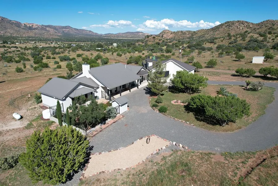 Stunning redesigned 3 bed, 2.5 bath home on 20 acres with concrete and tile floors, and vaulted and 9-ft ceilings throughout. The open layout includes a custom kitchen island, sequestered master suite, and screened porch with spectacular mountain views. Features a new insulated garage with rooftop deck for stargazing, a workshop, and a 1,000 sq. ft. barn. With a private well + back-up, 11k gal. of water catchment for outdoor use, and native landscaping w/rock beds, this property is a must see!