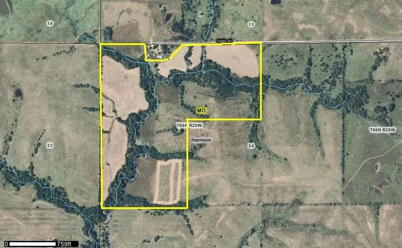 Great hunting in Harrison County, Missouri south of the town of Hatfield. This farm consists of timbered draws, creek, and thick timbered creek bottoms. $5,546 annual CRP payment. This is one of the smaller farms in the area, most of the farms are very large. Great location, just a few miles from the Iowa line and at the end of a dead end road. Harrison County is known for large whitetail bucks. Great hunting with a great return. You'll get a better return off of this farm than letting your money sit in the bank. This is one you need to look at!