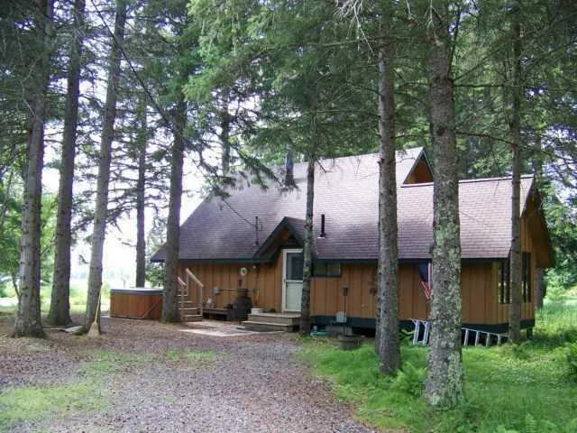 MIDDLE EAU CLAIRE LAKE - THE GREAT ESCAPE. Let this be your vacation paradise on the clear waters of Middle Eau Claire. 12 heavily wooded acres and over 954 feet of level sandy shoreline to enjoy with a unique lagoon on property. This chalet style year round features vaulted ceilings, natural woodwork, new bedroom addition and loft. Enjoy the view from the deck or hot tub. Heated 28 X 36 storage shed for all the toys you will need to enjoy the 4 seasons of recreation here! Property has development potential.