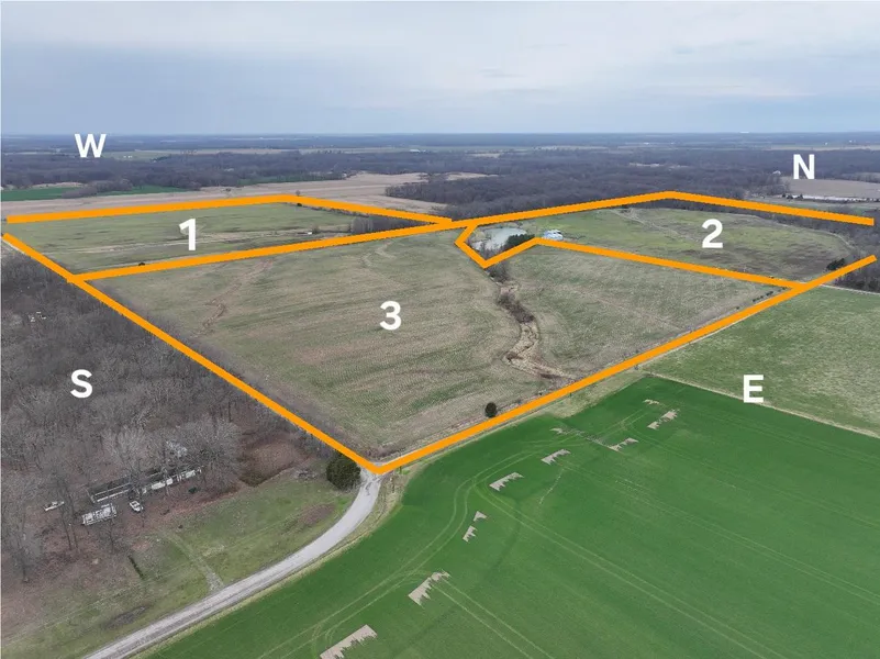 Tract 2 41.3 + or Acres, 29 + or tillable FSA Acres, 6.97 + or wooded acres connected to large parcels of timber, excellent Wild Turkey & Whitetail Deer hunting, 1.8 + or acre pond (another small pond northwest corner) & 60x50 pole building, 36x63 open end cattle barn, fenced in, located in Sec 32, Songer Township, Clay County, IL