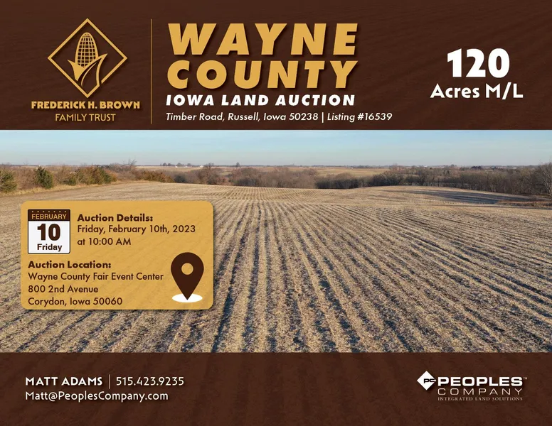Wayne County, Iowa Land Auction Mark your calendar for Friday, February 10th, 2023 at 10:00 AM! Peoples Company is pleased to be representing the Frederick H. Brown Family Trust in the sale of 120 total acres m/l located approximately six miles northeast of Millerton, Iowa, and approximately three miles directly west of Confidence, Iowa. The southern Iowa farm consists of a total of 101.22 FSA tillable acres with a CSR2 soil rating of 45.7, and includes a no-till conservation plan with a corn/soybean rotation. Primary soil types include Seymour silt loam, Seymour silty clay loam, and Edina silt loam. Currently, there are 94.04 acres being farmed. The balance includes wooded timber draws and a small pond on the northern end of the farm, which may provide additional recreational opportunities.