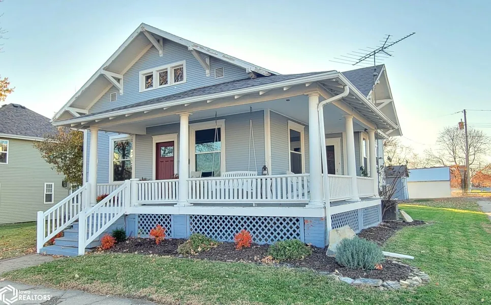BEAUTIFUL, CHARMING, CRAFTSMAN STYLE, 1924 COTTAGE, situated on a large corner lot, offering mature trees, shrubs, peach and apple trees, a raspberry patch, & is conveniently located 2 blocks from the Sigourney square! The wrap around front porch offers gorgeous views and is an excellent spot to relax. Inside you will find original hardwood floors and trim, 10 ft. ceilings, and large windows allowing an abundance of natural light in! The main level features a spacious eat-in kitchen, formal dining room, living room, two bedrooms with large closets, full, updated bathroom, laundry room, and enclosed back porch. The upper level features a HUGE primary suite with sitting area, bathroom, and laundry room. Would also make an awesome in-law suite or family room area. UPDATES GALORE, which include a new roof in 2024 & three custom, warrantied, exterior doors, updates in 2013 - energy efficient furnace and custom ductwork, new windows (lifetime warranty), kitchen remodel (appliances included dishwasher 2024, refrigerator 2023, stove & microwave 2014), Second story remodel in 2022, added laundry room, bathroom with soaking tub, and bedroom with extra storage and built-ins with added mini split HVAC unit 2021. Closed cell, spray foam insulation professionally installed in the basement including the ceiling in 2020, and water heater (and additional shut off valves) 2019. Sale also includes two washers and two dryers. Don't miss out on the opportunity to make this property your own!