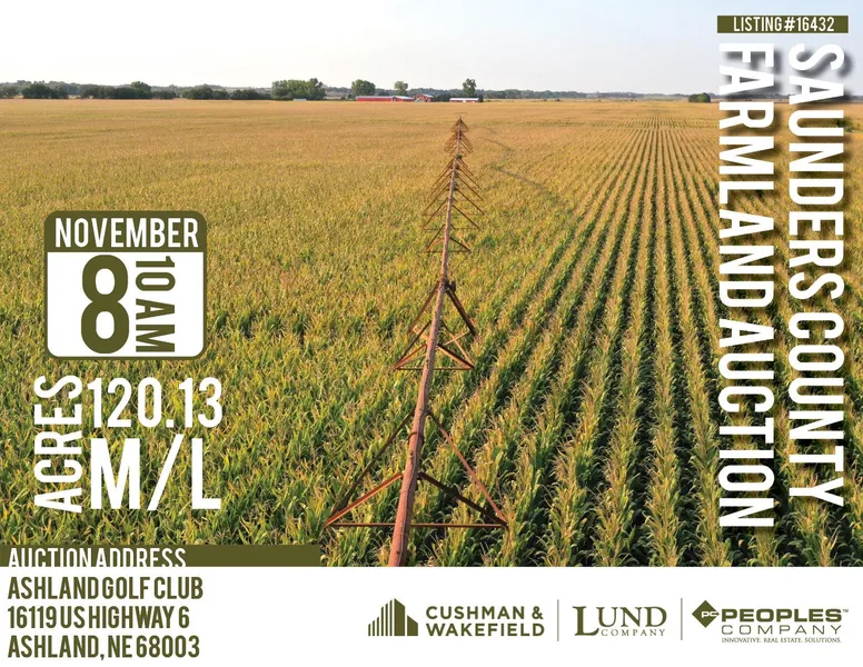 Saunders County, Nebraska Farmland Auction - Mark your calendar for Tuesday, November, 8th 2022 at 10:00 AM! Peoples Company and the Lund Company are pleased to be representing the sale of 120.13 total acres m/l north of Ashland, Nebraska. The property consists of approximately 117.58 FSA cropland acres of which approximately 60 acres are irrigated through a 2008 7 Tower Zimmatic pivot with the balance of the acres in dryland production. Primary soil types include the productive Gibbon silt loam and Lamo silt loam. Located in a strong farming community, this farm would make for a great add-on unit to an existing farm operation or investment-grade quality land purchase. The farm will be offered via live public auction as one individual tract, with simultaneous online bidding available. The auction will take place at 10:00 AM at the Ashland Golf Club, 16119 US Highway 6, Ashland, Nebraska 68003.