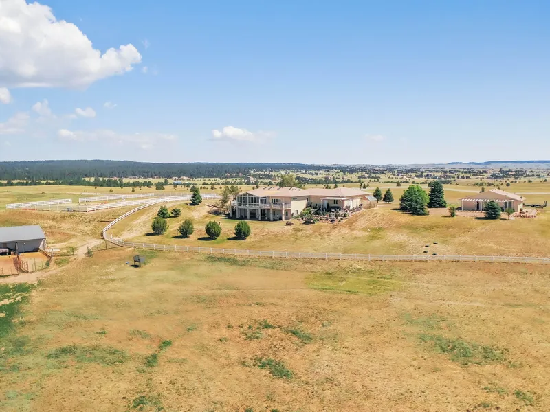 Amazing opportunity to purchase a rare gated horse property in eastern Black Forest on almost 40 acres with phenomenal 360-degree views! Custom rancher with over 4,000 square feet, a separate 1,200 sq ft guest home, 48x75 RV garage/workshop, 60x100 indoor arena, 30x40 attached workshop, fenced outdoor riding arena and two barns. Parking for 16+ cars and RV parking. Very quiet and private close-in location near the amenities of Falcon. Completely fenced with multiple pastures and horse obstacles. Income-generating guest house. Could be a vacation rental, long-term rental or for personal use. Fully remodeled custom rancher perfectly positioned on a knoll to take advantage of the gorgeous mountain views. The RV garage workshop has a 14 ft overhead door, electric, workbench, basketball hoop and tons of space. The indoor arena has electric, multiple doors for great airflow and high-end rubber and sand footing. Two barns. One barn with tack room and two 12x12 stalls. The second barn with tack room, hay storage, room for 5 stalls, rubber mats, water and electric. No covenants or HOA. Property is zoned RR 2.5 which would allow subdivision to 2.5 acre parcels with county approval - - HUGE future value. Both homes are in fantastic condition. The main home has vaulted ceilings, air conditioning, a huge sunroom, updated lighting throughout. Totally remodeled kitchen with slab granite counters, french door stove, gas cook-top and stainless appliances. Finished walk-out lower level with huge family room, game room/theater room w/ wet bar, two additional bedrooms and a full bath. Tons of outdoor living space - two- large decks and two covered concrete patios --- all with amazing views and beautiful landscaping! Remodeled guest home with 2 bedrooms, 1 bath, large kitchen and living space w/ private outdoor space. Zoned for horses, other animals and outbuildings. Listing agent has virtual tour and marketing video. See this amazing property quickly!!