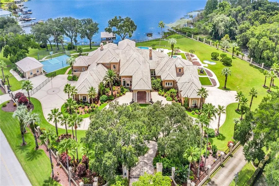 Incredible lakefront estate in historic Mt. Dora on Lake Gertrude with an additional parcel of land included for a total of 4 acres. Iron fencing securely surrounds this gated 10,983 sqft residence, sure to impress with dramatic coffered ceilings, painted gold leaf designs, imported chandeliers, and breathtaking views. Enter through the magnificent iron gates into the lushly landscaped courtyard with a portico and stately columns framing the entrance to the custom stone foyer that overlooks the sparkling pool. The elegant master suite features a morning kitchen, a private office, and a luxurious bathroom. The chef's kitchen features dazzling lake views, 6 Sub-Zero refrigerated drawers, and opens to the family room. There is a walk-in pantry with additional refrigeration plus another walk-in pantry with two full-sized Sub-Zero freezers. The butler's pantry is located off the impressive formal dining room perfect for large gatherings and holiday celebrations. A large laundry room plus a gift wrapping/craft room are located near the elevator. All bedrooms are en suites. It's easy to work remotely in the 2 spacious home offices. The detached guest house or caretaker's quarters will wow your guests! The upstairs features a large bedroom with an en suite and a theater room with a balcony overlooking the spectacular pool area. The resort-like amenities of this estate include an outdoor kitchen, koi pond, all-weather sports court, a large pool, wading pool, and spa are surrounded by marble tiered terraces spanning much of the home. The covered boat dock has 3 hoists on the private, spring-fed, crystal clear waters of Lake Gertrude. 2 garages provide space for 7 vehicles. Horse statues do not convey. Minutes to downtown Mt. Dora and 30 minutes to Orlando.