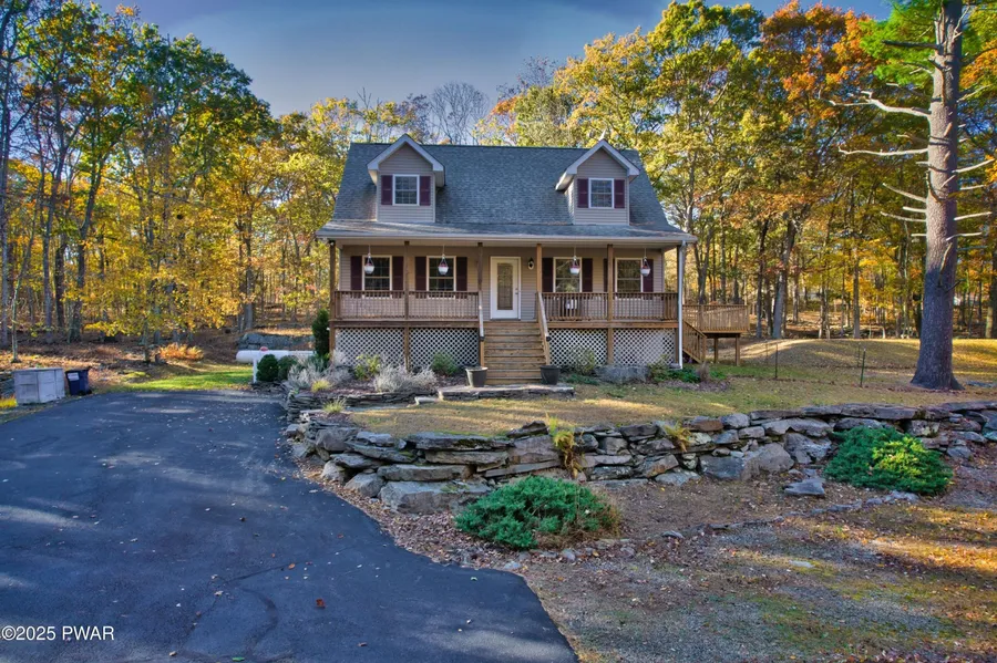 CAPTIVATING CAPE COD ON A PRIVATE, WOODED LOT! Welcome to this beautifully maintained, spacious home in the peaceful Pocono Mountain Lake Estates community. It features modern upgrades throughout, an expansive, newly renovated back deck, and a stylish interior. This home is equipped for convenience and peace of mind with a whole-house generator, security cameras, paved driveway, and an extra-large storage shed. Inside, discover the home's inviting warmth and timeless charm. The spacious eat-in kitchen features stunning quartz countertops, a modern sink, and ample workspace--perfect for casual dining and conversation. The main floor offers a welcoming living room with hardwood floors and a stylish propane fireplace, plus a primary suite with a full private bath and generous closet space. A convenient half bath/laundry room includes an innovative LG SideKick washer drawer beneath the main washing machine--ideal for smaller loads or additional capacity. Upstairs, you'll find three large, bright, and airy rooms, along with a full bath. The third room offers excellent flexibility and can easily be used as a home office, playroom, or an additional bedroom. The full, finished basement provides exceptional versatility, featuring a spacious family room/den area with a new mini-split system, propane wall heater, and a cozy wood stove--perfect for gatherings year-round. A second finished room is already wired for an additional kitchen, ideal for an in-law suite, guest area, or hobby space, and includes a half bath with the potential to convert into a full bath. Step outside to enjoy nature from the comfort of your covered front porch or the large back deck, both offering ideal spaces for relaxation or outdoor dining. This move-in-ready home blends modern comfort, thoughtful upgrades, and classic Cape Cod charm in a peaceful neighborhood --a rare find that truly checks all the boxes!