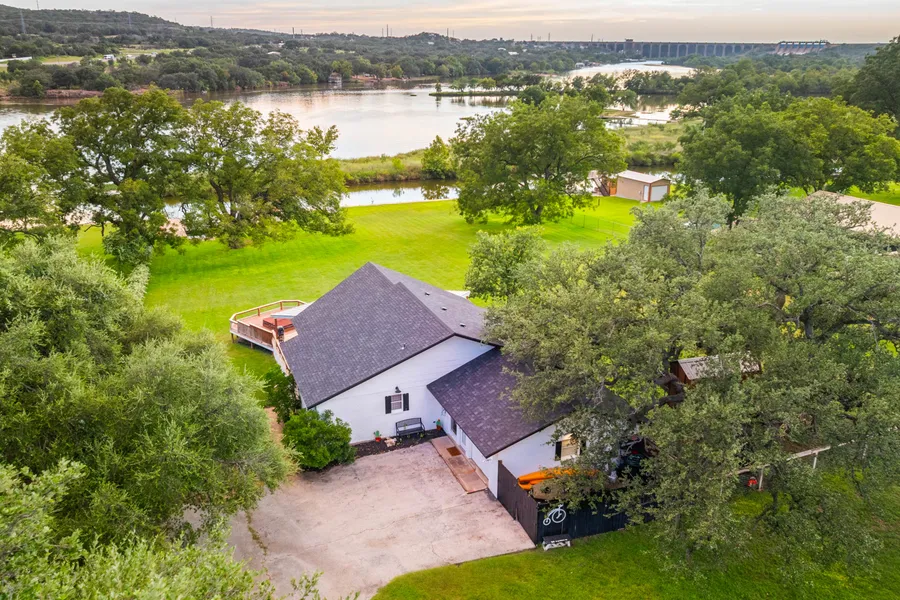 VIBRANT INKS LAKE COTTAGE Set on 1.2+ acres across two contiguous lots, this retreat boasts nearly 150 feet of constant-level lake frontage, shaded by majestic heritage oak and pecan trees, and embraced by soothing panoramic water views.