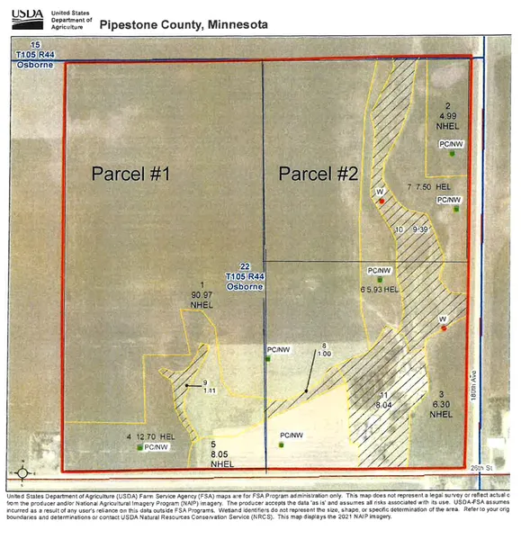 This Pipestone County MN Farm will be Offered as PARCEL #1 +/-80.90 Acres (W NE); PARCEL #2 +/-40.90 Acres (NE NE); or as PARCELS #1 & #2 Combined The +/-121.46 Acre Unit. This auction provides the opportunity to purchase a multifaceted parcel or parcels of land which has a mixture of productive cropland and areas which may have prospects for mining of gravel and other aggregates, and areas that may have hunting and recreational opportunities. This property has an excellent location bordered on the east by a County Hardsurfaced Highway and situated within 1 mile of Edgerton, MN. According to a preliminary FSA measurement it is estimated that PARCEL #1 +/-80.90 Acres (W NE) has approx. 79.41 acres of cropland; PARCEL #2 +/- 40.90 Acres (NE NE) has approx. 32.97 acres of estimated cropland; the FSA aerial map indicates the non-tillable acres on these parcels of land are comprised primarily of grassland, some areas with hunting and recreational opportunities and roads; presently this parcel of land is part of a larger parcel owned by the owners and subsequently will be subject to an FSA reconstitution and allocation of the cropland acres, crop bases and yields (presently the larger parcel contains approx. 156 acres which has a 23.29 acre corn base with a 126 bu PLC yield, a 57.73 acre soybean base with a 37 bu. PLC yield and a 20.59 acre wheat base with a 67 bu. PLC yield). According to the owners this property may conceivably have areas that may afford opportunities for future excavation of gravel and other aggregates. According to information obtained from Surety Agri-Data indicates the portion of the land included in PARCEL #1 has a soil productivity index of 64.8; the portion in PARCEL #2 appears to have a productivity index of a 54.8; and Parcels #1 & #2 Combined appear to have a productivity index of 61.4. The general topography of this land is gently rolling to undulating. The RE taxes payable in 2025 are part of a larger 160 acre parcel inclusive of the farmstead which is being retained by the owners, thus the taxes on the +/-121.46 acres being sold are presently unavailable.