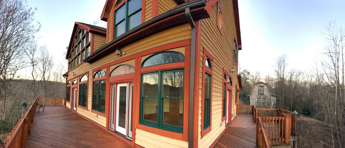 30.2 Acres - Hunting Creek in Wilkes Co NC. - Approx. 400+ft frontage on Hunting Creek. Beautiful farm home that's 95% finished would be ideal for a DYI enthusiast. There is great architectural detail throughout and just needs some finishing touches. The square footage does not reflect the area in the 95% finished basement, which has exterior access only at this time. Main floor of home has the Master suite, great room, an amazing kitchen that's nearly finished, an additional room surrounded by casement windows and could be used as a dining, craft or sitting room. There's a barn-style 1-car garage with an attached 2-car garage. There's also a small livestock/fowl barn with fenced enclosure, and a portable outbuilding that's been fitted with electric, water, window a/c unit, electric water heater, work counters and shelving that was previously used to process honey. Slopes range from level to gently sloping, offering lots of potential uses.