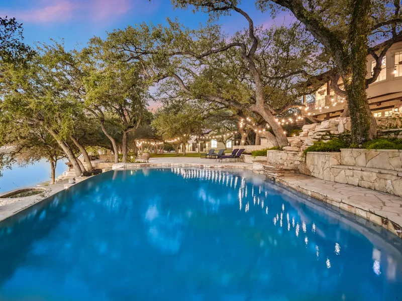 Breathtaking lakeside resort property with stunning views and acres of outdoor living spaces. Located on the main body of Lake Travis at the tip of Sunset Point, this extraordinary ten-acre property has been turned into a waterfront wonderland with dozens of stone terraces traversing the hillside down to the water. The vistas begin at the wide stone veranda where you will see the lake shimmering between heritage oak trees. Waterfalls spill down the hill connecting the upper spa to the negative-edge pool hovering over the cliffside; a second spa further towards the water offers another place to soak while looking out over the view. Host magical events where guests can wander from the main home down to the covered open-air bar and dining pavilion. Finish the evening around the fire pit gazing at the stars over the lake.