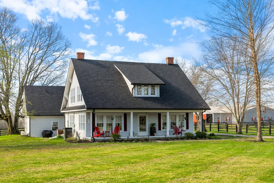 Own your own piece of quintessential Kentucky Bluegrass! This turn key horse property is perfectly located near I-64 and less than an hour's drive to Keeneland, Churchill Downs or The Kentucky Horse Park as well as being in the center of Kentucky Saddlebred Country. The charming updated farmhouse is a lovely residence for the stewards of this fine property. The sweeping front porch welcomes visitors to enter the home. Upon entering two warm and inviting gathering spaces with hardwood floors flank the entry hall. The sun washed living room or parlour has a corner fireplace and opens to the dining room through french doors and both offer views of the bucolic countryside. The other side has a spacious yet cozy den with a fireplace and flows into the well appointed kitchen. The kitchen has abundant cabinets, lots of counter space for food prep, serving buffet style or dining with an area for barstools. There is also an offset dining nook. Other defining features include stainless steel appliances, some glass fronted cabinets and a beautiful bay window overlooking the barn and horse pastures. A fresh and updated full bath is on this level as well as a large laundry mudroom which is an absolute necessity with farm life! The stairway leading to the second level is enchanting with gorgeous wood detail reminding one of yesteryear. The second floor has four large bedrooms also with hardwood flooring, a super cool meditation/reading/mini office room that boasts many possibilities and a luxurious spa like full bath, complete with large shower and separate soaking tub. The unfinished basement has loads of space for storage. The rear door walks out from the kitchen/mudroom area to a massive covered deck that is perfect for entertaining and dining al fresco. Additionally, there is an attached sun deck. The oversized two garage has plenty of room to house not only your vehicles but any gardening or yard implements/bikes, etc. Upstairs there is a very efficient guest apartment or carriage house with full bath, kitchenette and sleeping and living room. This could be used for visiting guests, a farm manager or even short term rental. The farm itself has an awesome barn. fenced paddocks with run in sheds, hay field, pond and an old dairy barn that one could use their imagination to transform into many uses. The way this farm has been set up maximizes the land in a very practical way. It could be a great breeding operation, lay up facility, training barn or boarding facility with 9 acres of fenced paddocks and pasture. The main barn has 13, 12 x 12 stalls with built in hay racks, tack and feed room, equipment storage, wash rack and trailer garage. The aisle ways are wide enough to get some indoor exercise in inclement weather too. This is an incredible opportunity to purchase a turn key horse property in one of the most sought after areas of The Bluegrass.