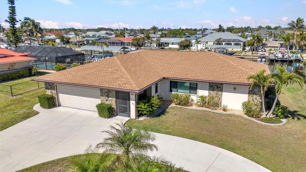 DIRECT SAILBOAT ACCESS with a NEW 2023 SEAWALL by Honc Marine and freshened LANDSCAPE! This 3 Bedroom, 2 Bathroom, 2 Car Garage POOL HOME sits on an oversized lot with 100 FEET OF WATERFRONTAGE just MINUTES to Charlotte Harbor and the Gulf of Mexico. NO HOA FEES & FLOOD INSURANCE IS TRANSFERABLE! CLICK ON VIRTUAL TOUR LINK 1 FOR THE VIDEO AND LINK 2 FOR THE 3D TOUR. This solid, well-maintained home features a bright open floor plan, bamboo & tile flooring throughout, vaulted ceilings, crown molding, recessed & pendant lighting, and MUCH MORE! The inviting living and dining areas flow seamlessly into the EAT-IN kitchen, which showcases cherry cabinets, stainless steel appliances including a double oven, granite countertops, and a convenient service window to the lanai. The spacious master suite offers lanai access, a walk-in closet, and a private en-suite bathroom with a glass-top dual sink vanity and a walk-in shower with a seating bench. The guest bedrooms are split for added privacy—the 3rd bedroom functions perfectly as a flex room and includes a Murphy bed, ideal for guests or office use. A guest bathroom with lanai access is conveniently located nearby. Step outside to the large screened lanai—perfect for morning coffee or evening relaxation—and enjoy your HEATED saltwater pool and spa, spacious pool deck, and peaceful tropical surroundings. Waterfront living at its finest awaits with a 10x20 dock, 8,000 lb. boat lift, water, and electric at the dock. A 16x10 storage shed adds even more functionality for tools, toys, or hobby needs. 2023 ROOF - HURRICANE PROTECTION - AUTO POOL CLEANER & OVERFLOW - 2023 WINDOWS IN FRONT & MASTER BEDROOM SIDE - SCREENED FRONT ENTRY - 2023 SEAWALL BY HONC MARINE - UPDATED LANDSCAPING - 16x10 STORAGE SHED. Conveniently located just minutes from US-41, and Port Charlotte Beach Park. Port Charlotte Beach Park offers sand, sheltered waters, and spectacular sunsets year-round. Amenities include a boardwalk with a fishing pier, boat ramp, canoe/kayak launch, horseshoe pits, bocce courts, basketball courts, tennis/pickle ball blended courts, volleyball court, playground area, small shelters with picnic tables, two large pavilions, and restrooms. Also just a short car ride to the Gulf Beaches of Boca Grande, Englewood, or Manasota Key to name a few where you will find world-class fishing and white sand between your toes. LOOKING TO PURCHASE A BOAT? THE BOAT IS AVAILABLE FOR PURCHASE ON A SEPARATE CONTRACT, SEE ATTACHMENTS FOR DETAILS. Schedule your showing TODAY!