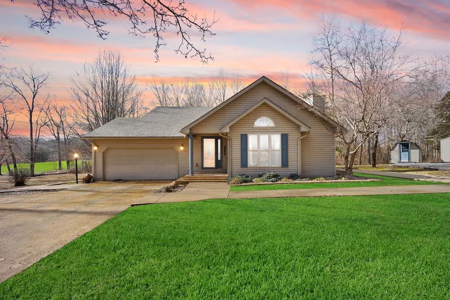 Welcome to 122 Woodland Dr., where peaceful and convenient living meet just a minute from Downtown Columbia and Lindsey Wilson College. Nestled on 1.57 acres, this charming home offers 3 bedrooms, 2 full bathrooms, and nearly 1,500 sq. ft. of comfortable, one-level living space. Step inside to find a warm and inviting living space with a vaulted ceiling accented by exposed wooden beams, a large picture window, and a beautiful fireplace as the focal point. Wide-plank wood floors flow seamlessly throughout, adding character and charm. The galley-style kitchen comes equipped with like-new stainless steel appliances that remain with the home. The primary suite is a peaceful retreat, featuring a newly renovated ensuite with a walk-in tiled shower and double vanity. Other recent upgrades include fresh paint, modern lighting, and a brand-new roof. The attached two-car garage offers additional storage and serves as a utility space, with the washer and dryer included. While an adjoining sunroom offers the perfect spot to enjoy your morning coffee or unwind with a good book, it leads to a sprawling wrap-around back porch for you to enjoy the peaceful surroundings, while the private backyard features a cozy fire pit area and a wooded backdrop leading to a small creek. Multiple outbuildings, including a detached garage, workshop, storage shed, and playhouse, provide ample space for projects, tools, and outdoor equipment. This property offers a serene country feel in the convenience of town; this home is a rare find in a fantastic neighborhood. Dont miss outschedule your private showing today!