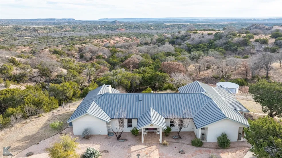 This one-of-a-kind property combines Southwest charm with modern amenities, set against a backdrop of breathtaking natural beauty. A half-mile drive from the county road leads to an elevated perch, revealing a Southwest-style stucco home surrounded by expansive vistas. A flagstone walkway welcomes you to the front door and into a light-filled gallery. Double doors open to a spacious living room with a native stone fireplace and a picture window framing stunning views of the local mesas, canyons, and Buffalo Gap in the distance. The heart of the home is undoubtedly the kitchen with ample space for hosting and everyday living. Additional space is the home library. The master suite features a tiled shower, walk-in closet, heated bathroom flooring and an adjoining sitting room with access to a covered porch. Located on the opposite side of the house is the second bedroom and full bath complete with its own breathtaking views. A short distance from the home is a charming one-room space with a fireplace equipped with a three quarter bathroom and small kitchenette, attached to a garage, perfect for visitors or extra privacy. The original house was remodeled, new construction during 2011. The flooring is tile, stained concrete and cork. Other features include heat pump, windows by Anderson and Marvin, skylights, covered porches, metal roof, underground power, fiber optic internet, custom sound system, landscaping by Masterscapes- maintained by the engineered 20,000 gallon underground water catch system. The terrain is unique. Native grass pastures quickly turn to cliffs and distinctive rock formations. Fall color is vibrant with various species of oaks. In Spring open field grass is green, dotted with wild flowers. A former cistern converted into a stone tower offers a birds eye view, perfect for stargazing or soaking in the landscape. Enjoy spectacular sunrises and moonrises over Buffalo Gap from the living room, den, sitting areas, and multiple porches.