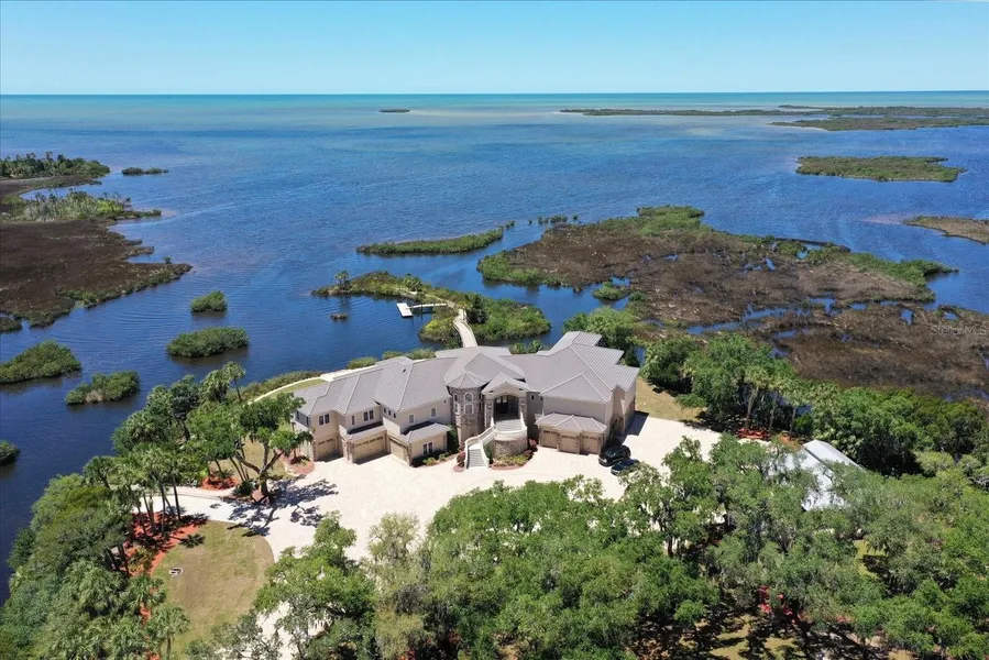 PRIVATE TROPICAL GULF OF MEXICO LUXURY ESTATE – This stunning Gulf front property, comprised of over 23 acres, with over 1,100 feet of waterfront on the Gulf of Mexico, with incredible water views from every room is a one-of-a-kind opportunity. The residence is comprised of 5 bedrooms and 5/2 bathrooms in over 8,950 sq ft of living area. Bathed in sunlight, the split plan residence comprises a large entrance hall, living room, generous dining room, butler’s pantry, gourmet kitchen, 350-botle wine cellar, large walk-in pantry, informal dining area, family room, billiard room, library, professional built 28 seat home theatre, exquisite master suite, opulent en-suite, all showcasing breathtaking views of the Gulf of Mexico. Gated, safe & secure, with a generator that will run the entire home for a month. Outside, a magnificent west facing terrazzo terrace extends the entire length of the home, with an outdoor kitchen with breathtaking Gulf views. Outdoor highlights also include a boat ramp, rustic boat house, a historical rustic guest house, a bridge which leads to an island with a floating boat dock, and double (lighted) tennis courts all amid the beautiful coastal wilderness. A car collectors dream featuring a 40+ car garage, with height for car racks and 12 garage doors, including a utility door, for Helicopter or RV and spans the entire space under the home. The 30,000 sq. ft. motor court makes landing a helicopter easy! The region is a prime spot for water sports and fishing. One of Florida’s most captivating Gulf Coast homes, this private, opulent home is cleverly designed to maximize its position overlooking the Gulf of Mexico.