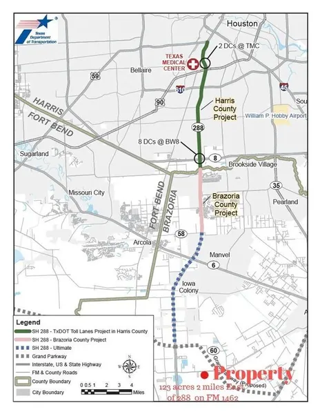 123 ac on FM 1462 just 2 miles E of 288. Currently ranch use, however location lends to residential or commercial development. Not in City limits! Mostly Flood zone x, 2 mi from 288 toll extension proposed and 1/2 mi from proposed Grand Parkway. Cattle fencing, 3 solar operated wells, barn, large lake built for hunting club use. Duck hunting heaven!