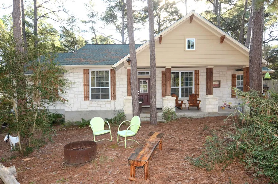 Towering pines! ~ Stone & cedar home nestled in Lost Pines! Craftsman style white stone home with cedar shutters & trim. Wonderful front porch & 20x13 rear covered patio to enjoy lovely setting. Open floor plan with color hardened concrete floors, stained concrete kitchen counters & stainless steel appliances. Very private, secluded lot with fenced yard & 12X16 studio built in the back with HVAC & electricity installed (no plumbing). 10x10 storage building conveys. Property was not affected by fires.
