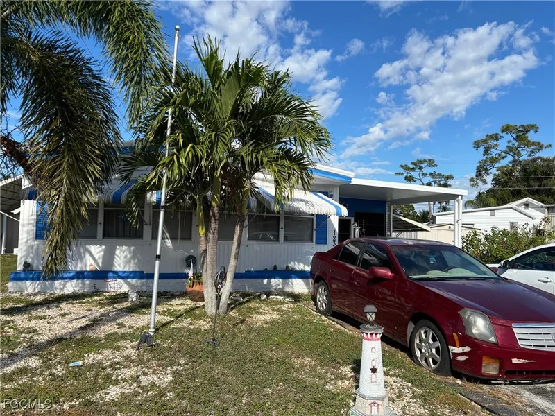 Two bedroom 2 bath home with island/breakfast bar kitchen. Large family room off of the kitchen with dining room & spacious light bright living room with windows all along the front & also one whole side of the home letting the sun shine in. This comes furnished and includes a laundry room behind the carport with washer & dryer. HOA fee is $28 per month & is voluntary. This covers the potable water. Updated appliances, 2 full bathrooms plus carport & storage shed. A good majority of the flooring is wood look vinyl panels. There is an enclosed lanai behind the carport. This is a good size home with large spacious living spaces. Convenient N FT Myers location. More photos coming.