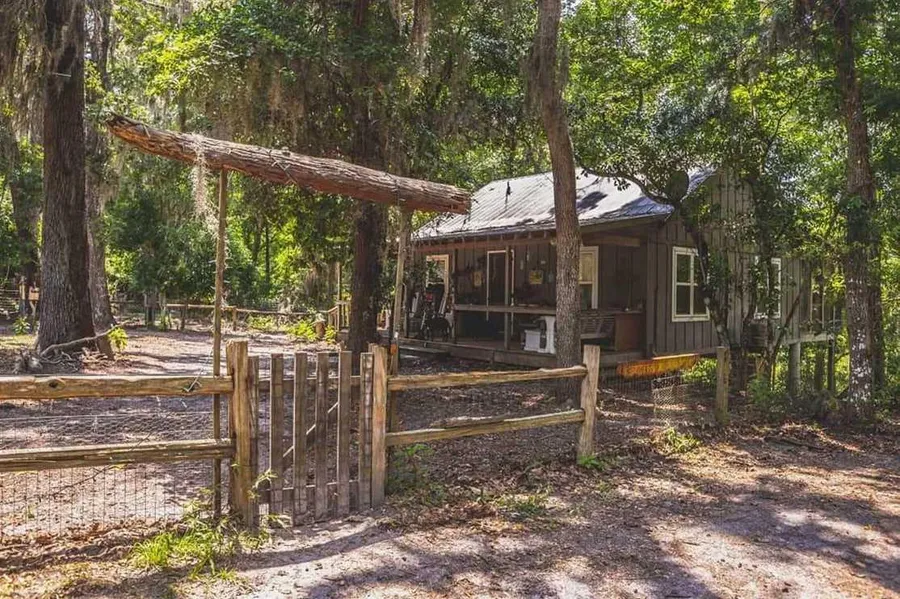 Secluded Cabin and small farm on 8.3+/- Acres on the Satilla River in Camden County, GA with a shared ownership of 250+/- Acres of Riverfront land. The home is a 1 bedroom, 1 bath board and baton style cabin sits high on a 60' Bluff over looking the Satilla River Basin and has 274' ft of frontage directly on the river that is privately owned as part of the 8.3+/- Acres. The home is 810 sqft and is an open floor plan with spacious kitchen living room combo and includes woodstove, heart pine floors and refurbished antique doors throughout, laundry closet, pantry, modern appliances, lots of windows, front covered porch, back deck and large screened porch overlooking the bluff. The property includes large pole barn, fenced and irrigated organic garden and orchard including blueberry bushes, trellised grape vines and fruit trees. The barnyard area is fenced and cross fenced for goats, chickens and other animals making it a perfect hobby farm. There is plenty of room to expand the home or build another larger home. Water is supplied by a Community well shared by the other 5 homes.