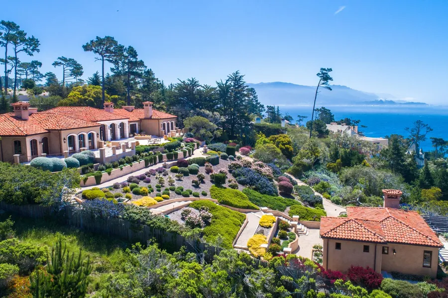 Introducing Villa Okeanos with the best ocean views above prestigious 17 Mile Drive; a rare and extraordinary work of art that embodies the authentic spirit of a Mediterranean Villa. Sited on 2 acres, this estate is rich in ultimate privacy and serenity. Possessing spectacular and sweeping 200 degree views of the Pacific Ocean, there are 3,000 sq.ft. of limestone terraces for enjoying sunsets. European gardens complement the terraces, courtyard and outdoor kitchen with pizza oven. All on one level, the main house and guest house total nearly 8,000 sq.ft. with 7 bedrooms, 6 are ensuite, 2 are primary suites, a chefs kitchen, 2 laundry rooms, formal and informal dining, living and family rooms. Stunning masterwork is illustrated throughout, from gold leafed hand painted domes by Shelly Cost, antique ceiling, hand carved Chambertin French Limestone by Christopher de Rose to award winning designer Roger Harned, world-class artists worked side by side to create this opus.