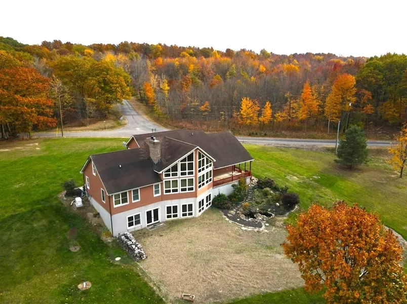 We are pleased to present a spectacular hilltop home with westerly views for breathtaking sunsets overlooking a tranquil 1.4 acre pond and gentle pastures. This chalet style home is a wonder of windows bringing the outdoors indoors where you can enjoy the splendor of all four seasons from your great room and kitchen. Upon approach this 4 bedroom 2 1/2 bathroom country retreat presents itself with a large front yard and new walkway to the front door. The landscaping is detailed with flowers and shrubs from a green thumb's touch, and complimentary to a larger garden space with a water feature in the backyard. A large metal garage is proximate to the home with two 14 foot doors and plenty of space for boats, tractors, coaches and hobby equipment. It also has its own natural gas heater and separate 100 amp service panel to support any use you may have. Inside the home, a large entry foyer that draws your eye up to a vaulted great room with a magical array of thirty-six windows bringing light and vista-like views into your new home. A gas fireplace is here for ambiance and the perfect detail like an alpine chalet for winter evenings watching snowflakes fall over the acreage. Looking up to the loft, a tongue and groove ceiling of Butternut wood leads you to two bedrooms that also enjoy the windows from the hallway. The owner's suite has a walk-in closet and its own ensuite bathroom with shower and corner tub featuring more windows looking over the pond. A second room on the lower level could also be used as an office for a remote worker. Two bedrooms are upstairs with another full bathroom. One of the bedrooms has an unfinished expanded space that would make an excellent teen room or hobby room. At the end of the hall a second bonus room could be finished for a media room, playroom or cozy reading room. Use your imagination. The open style kitchen has Corian countertops and leaded glass cupboards, a detail that stands out in the kitchen. A covered porch is located off of the great room, and becomes a wonderful private space to enjoy your summer iced tea or morning coffee. The basement should be described as the lower or ground level as it has the same footprint as the main level. Having its own window detail that looks west with its walkout doors, this level can be finished into a completely new and different living space with ample room for a pool table, more bedrooms, a gym or indoor storage. A wood burning fireplace is a centerpiece of the basement to design a room around. The lower level has the same foot print as the main level and is also plumbed for adding a bathroom, and has a 9' ceiling. The pond is trimmed and well maintained, and for the fisherman, it has a large population of largemouth bass, with lunkers reported in there too. There are several fenced pastures suitable for cattle or horses, needing only a barn to call home. With privacy, views, a house on the hill and a picture-perfect country setting, this is a special place anyone would love to come home to. Check this one out before it's gone, it's priced well to sell! ADDITIONAL INFORMATION: New hardwood floors, New Carpet, New Generac whole house generator with 7-year transferable warranty, New front door paver walkway, Recessed lighting, New faucets, Main floor laundry, MF 285 Tractor included with implements, GMO's convey, Well with water treatment system, Septic, Natural gas radiant heat, Zone heating, 2 car attached garage, Pond, Pastures, 1 acre garden, Run in shed. 2.8 miles to Forestville, NY, 1.6 miles to I-90, 8.3 miles to Dunkirk, NY, 3.2 miles to Silver Creek, NY. 27 miles to Buffalo/South towns, 4 miles to Lake Erie Shore line.