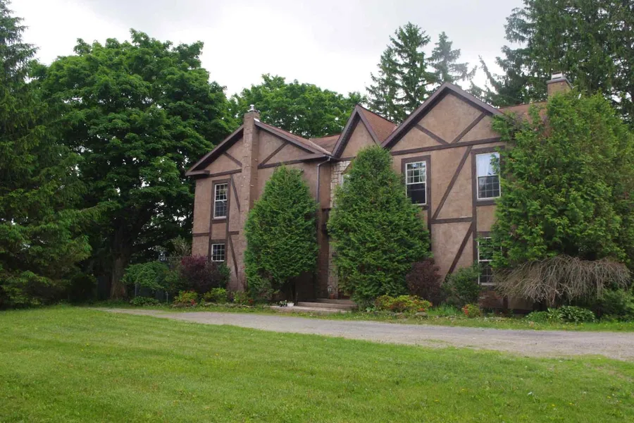 Outside, the rich and opulent colonial appearance of the interior gives way to a more European feel, with stuccoed walls and exposed exterior beams. The home is hidden in its own tiny forest of gigantic spruce and maple trees, with cedars interspersed in places. There is a 20x30' 3 car garage. You will find a 12x28' shed (old) and 2 sections of lawn enclosed by chain link fences to make it dog safe. There is also a 12x66 concrete pad where a trailer once stood. It has its own septic.