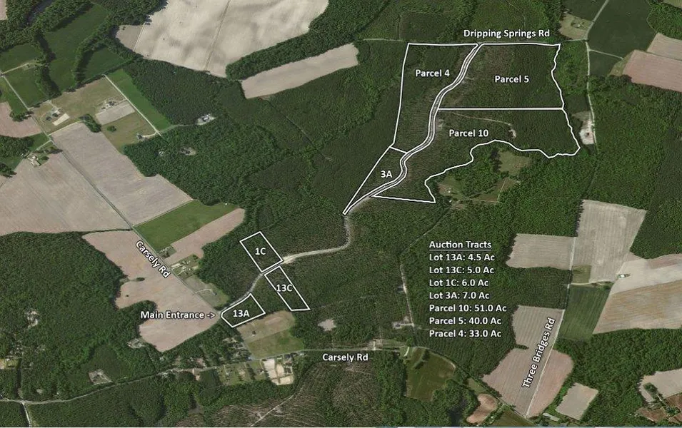 124 WOODED ACRES offered in 3 tracts of 33ac, 40ac, and 51ac. Nicely wooded with the majority in loblolly pine. Each parcel features a stream and several perc sites. Great access with over 1,850' of road frontage on Dripping Springs Rd and long frontage on private road. Ideal for large residential tract, recreation, horses, hunting, or timber investment.