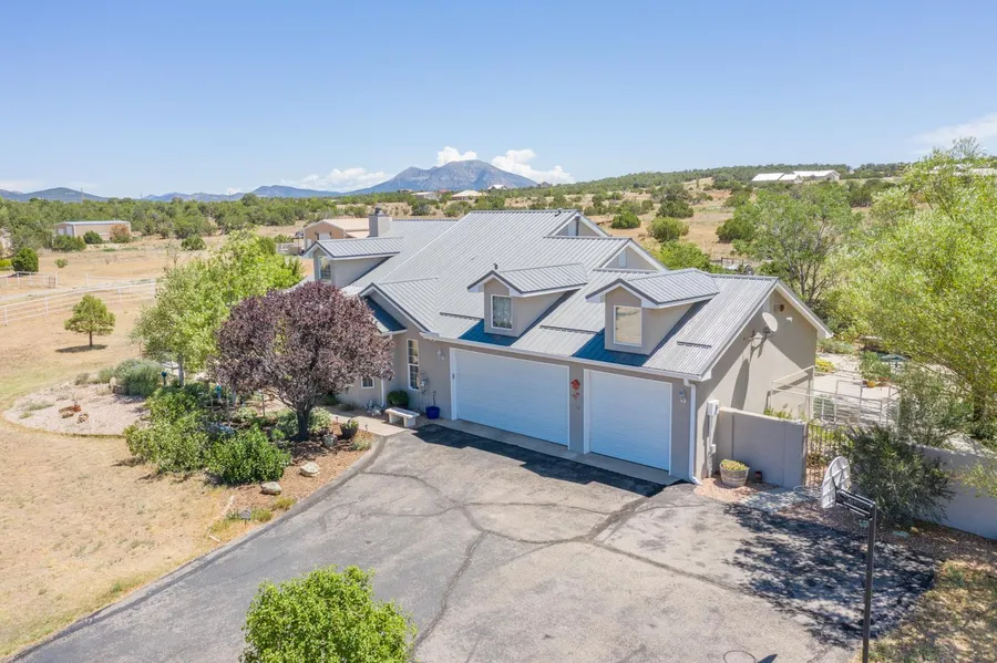 Absolutely charming home in Richland Meadows with lovely landscaping that frames enviable views from the vast wrap-around porch. The walled back courtyard includes shade trees, a lush lawn, garden pond, & ample patio space for year-round outdoor entertaining. Don't miss the huge kennel with doggie door to the pet pen in the garage for the furry friends. Heavy gauge metal roof & seamless gutters are only a year old, and synthetic stucco keeps maintenance minimal. Gorgeous vigas and corbels add charm, while dormers & skylights add natural light. Cozy kiva fireplace and soaring ceilings grace the living area, while the kitchen boasts SS appliances, an extra large pantry, breakfast bar, dining nook, as well as a personal office. Custom features throughout! Paved drive and parking- no dirt road. Generous owners' suite has coved ceiling, with dual closets, dual sinks, jetted tub and separate shower. Four Season sunroom sits just off the suite, equipped with a pellet stove for those chilly winter evenings. Over-sized 3-car garage has space for the pet pen, a workbench, and a shower- that's right- a shower! Hen house and large, secure walk-in chicken run rests outside the courtyard. This gently sloping highland meadow lot would make a great horse property!