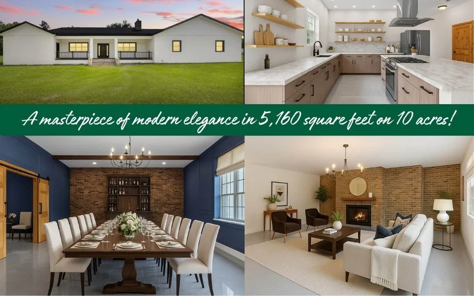 A MASTERPIECE OF MODERN ELEGANCE! Welcome to your dream country estate on 10.14 fully fenced acres, offering plenty of room for horses, animals, or simply enjoying the open space. This beautiful 5,900+ sq ft total home structure features 4 spacious bedrooms and 3 full baths, perfect for family living and hosting friends. The large chef’s kitchen is made for entertaining, with plenty of counter space, custom cabinetry, and a huge walk-in pantry. Relax by the cozy fireplace or step outside onto the front and back porches to take in peaceful views of the pastures. Need to work from home? Two private offices provide quiet, comfortable spaces to focus. This home blends luxury and comfort in a peaceful setting, giving you the perfect balance of elegant living and country charm. Whether you’re raising animals or just want space to breathe, this property is ready for your next chapter.
