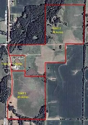 Total acreage 125 acres offered in 3 Tracts ranging from 6 to 74 acres, in Township 53 N, Range 9 W, Sections 1 and 12, Monroe County, MO.