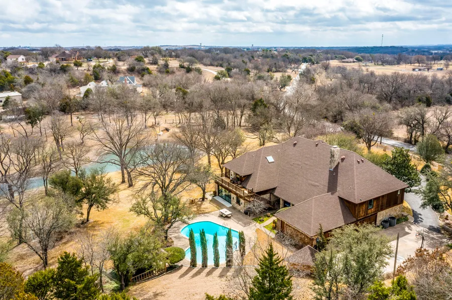 Lavish Dream Estate on Aledo's coveted Jenkins Road! Gorgeous 7288 sqft Villa on 6 exquisite park-like acres that include a sparkling pool, beautiful manicured land, spectacular trees, a serene pond, 3-stall shed row barn, and huge workshop! Completely remodeled! Brand New kitchen. Spectacular din. Expansive Living room with vaulted ceiling. Extraordinary new windows in every room with gorgeous views! Fabulous master suite with exercise-sitting area & private balcony. 4 Dedicated Guest Bedrooms! Executive Office. Game room. Wet bar. Wine cellar basement. Catering Area. Two large AC storage rooms. Oversized 4-car garage with attached work-hobby room. Fenced and cross fenced! Bring the horses and cows! Your slice of paradise is waiting!
