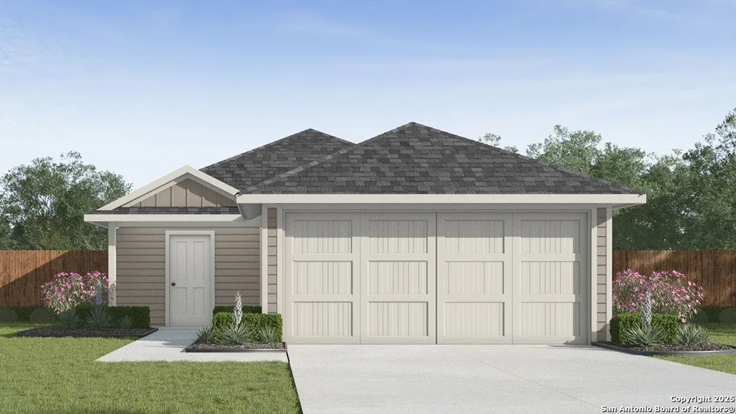 The Estero is a charming one-story home featured in Avenida in Converse, TX. Featuring 2 classic front exteriors, this 4 bedroom, 2 bathroom home also offers 1586 square feet of living space and a 2-car garage. A front porch (per plan) welcomes you into the home and opens to the gourmet kitchen which includes quartz counter tops, shaker style cabinets, stainless steel appliances and an open concept floorplan with the kitchen flowing seamlessly into the dining room and living room. The main bedroom has an attractive ensuite bathroom that features a quartz vanity countertop, shaker style cabinetry and a spacious tiled walk-in shower. Enjoy additional storage with a large walk-in closet in the primary bedroom. Your secondary bedrooms all feature quality carpet flooring and a closet, and can be used as bedrooms, offices, work out spaces or other bonus rooms. The possibilities are endless with The Estero floor plan. Additional features include sheet vinyl flooring in entry, living room, and all wet areas, quartz counter tops in all bathrooms and HOME IS CONNECTED base package. Using one central hub that talks to all the devices in your home, you can control the lights, thermostat and locks, all from your cellular device.
