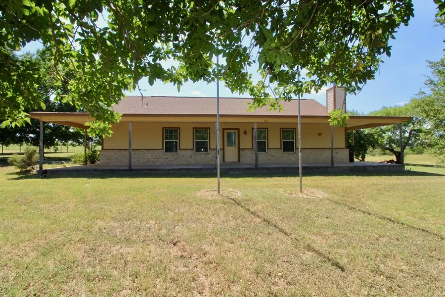 Sweet country gem! 3BD/2.5BTH, 1,500 sq.ft. home on 5.04 ac. featuring open floor plan, white rock fireplace, huge walk-in pantry w/ room for additional freezer and Jack/Jill bath between secondary bedrooms. Master suite w/ walk-in closet & bath with garden tub / separate walk-in shower. U shaped covered porch wraps the house providing beautiful views of stocked tank w/ windmill. Fenced and BMA irrigated with 4 car carport, storage shed, motorized gate, several spigots to water and tons of mature trees.