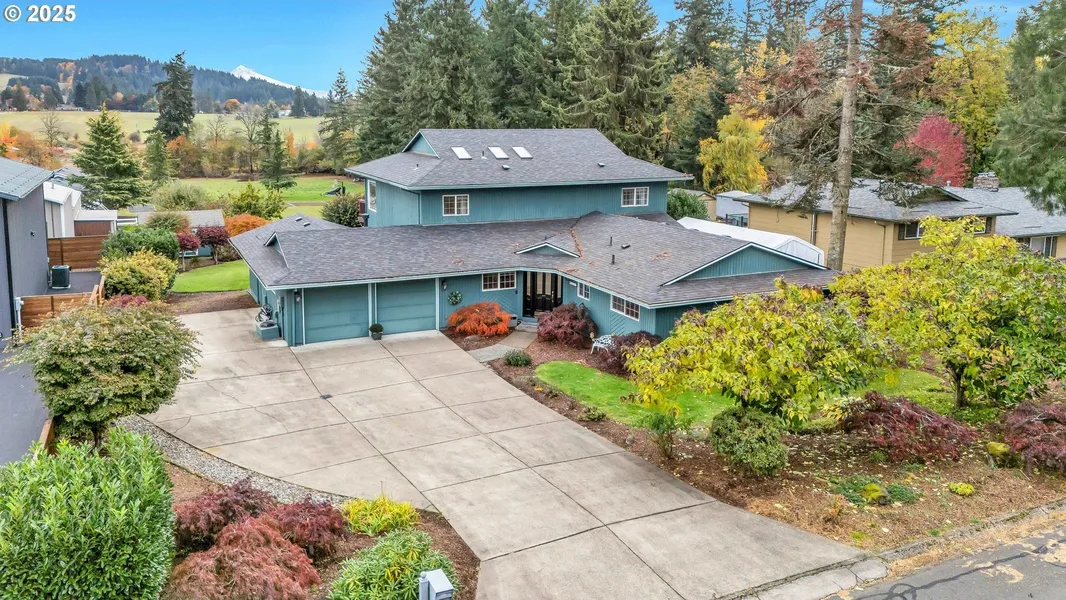 Stunning 5-Bedroom Home with Mt. Hood Views & Exceptional Outdoor Living. This serene cul-de-sac home features 5 bedrooms plus a bonus room and sits on a flat, just under 1 acre usable lot with shop potential and breathtaking Mt. Hood views. The home was fully remodeled and expanded in 1995 by the same creator of the Street of Dreams, the home offers versatile and generous spaces throughout! The primary suite is a retreat with dual sinks, jetted tub, walk-in shower, large walk-in closet, and three additional closets, framed by a wall of windows with unobstructed views. Outdoor amenities include manicured gardens, a small orchard, 16 Japanese maples, a plum tree, a tennis/pickleball court, double-decker very spacious decks with a hot tub, and a cozy fire-pit. Entertain in the oak-floored kitchen with a porcelain island, gas appliances, pantry, and family room with a 10-ft wet bar, flowing to the dining room. Convenient RV/boat parking, storage shed, and barn provide ample space. Recent updates: new roof (2022), furnace (2023), LVP flooring (2024), and newer carpeting. Additional features include a 6th bedroom/home office, 2 AC, skylights, 9-ft ceilings, and central vacuum. Move-in ready, private, and peaceful-with deer often visiting the backyard.