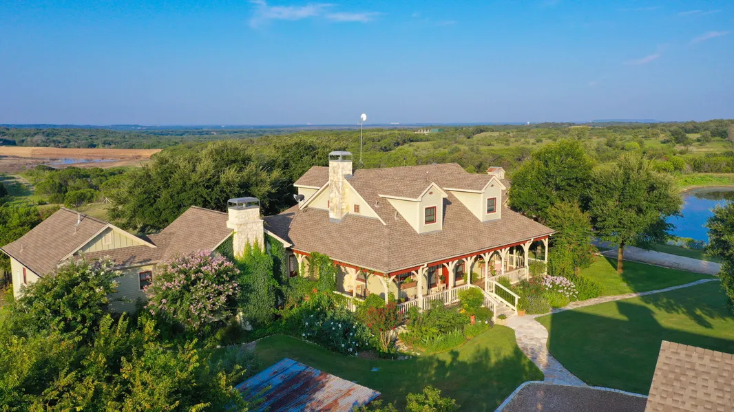 The one-owner home with 3 bedrooms and 3.5 baths was originally built in 2004 with a large addition constructed in 2012. The kitchen, dining and living areas are open and adjoin a large second living area that is filled with windows and spans the rear of the house. Hardwood floors are throughout the home with travertine in the kitchen and bath areas. The first-floor master suite includes a large sitting area with gas fireplace, expansive bath with all the amenities and direct access to the screened patio. A large wrap around porch at the front of the home overlooks flowered landscaping, a 5-acre bass fishing lake and scenic 2-acre pond, while the large back porch and screened patio look south across wooded areas to the Brazos River valley.