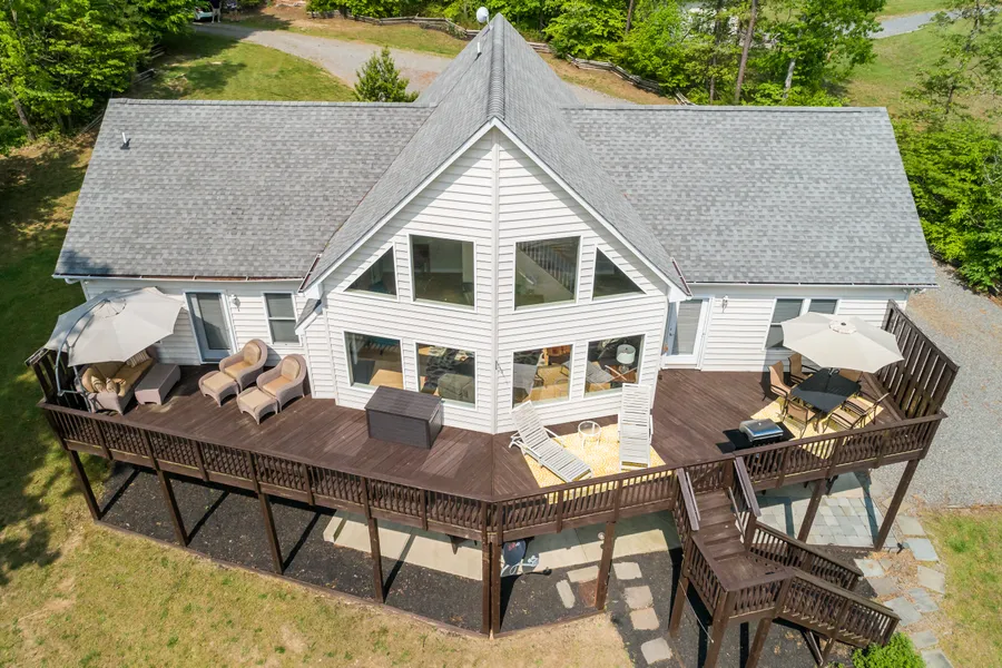 Inviting waterfront home overlooking a quiet deep water cove on the private side of Lake Anna. The cathedral windows overlooking the water welcomes you as soon as you enter the main living space. The home has an open main level floor plan which features a large kitchen with breakfast bar, open dining space, and large living room with propane fireplace. The home boast 4 bedrooms and 4 full bathrooms. The spacious master bedroom features a large master bath and large walk in closet as well as access to the lake side deck. The upstairs bedroom also features its own en-suite. The second main floor bedroom is right next to a full bath as well. Once you move to the downstairs, there is a second living room and very large fourth bedroom, offering both a king and queen size bed, with room to spare. There is also direct access to the 4th full bath from bedroom 4. The outside features; a deck that spans the back of the house as well as a lower patio level that allows direct access to the downstairs via 2 sliding glass doors, firepit, sandy beach and dock.