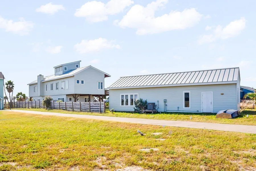 Welcome to YOUR VIEW of the Gulf from this custom built beach house that seamlessly blends the artistic flair of a French artist with the relaxed elegance of coastal chic. Open floor plan is bathed in natural light with hardwood floors over 170 yrs old from a Texas farmhouse. Kitchen boasts rustic open shelving, concrete counters and a charming apron front sink. Each of 3 bedrooms in the Main house is a private sanctuary with en-suite baths, exposed beams and lots of natural light. Bonus room off downstairs bedroom could be used as 4th bedroom, office, exercise room, etc. Detached garage is actually a private studio with kitchen, living, bed & bath. This home is zoned for short-term rentals & rests on over 17,000 sf of land! While perfect for full time living, rent out the entire home and studio, or just rent the studio for additional income! With an incredibly sized back yard, build your dream swimming pool, outdoor kitchen and palapa bar! Well water is available!! A spacious deck offers the perfect spot for alfresco dining with water views. This location is dreamy! Nestled in a quiet part of town, yet so close to all Port Aransas has to offer! A must see!