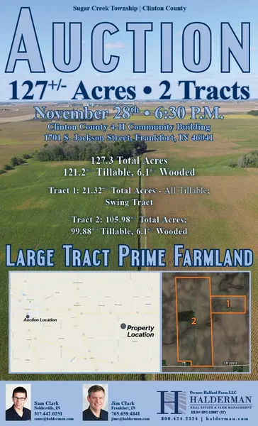 Legal Description: A part of the East of Section 22 containing 21.32 acres more or less and a part of the West of Section 22 containing 105.98 acres more or less, all in Township (Sugar Creek) 21 North, Range 2 East of Clinton County, Indiana, containing all together 127.3 acres more or less.